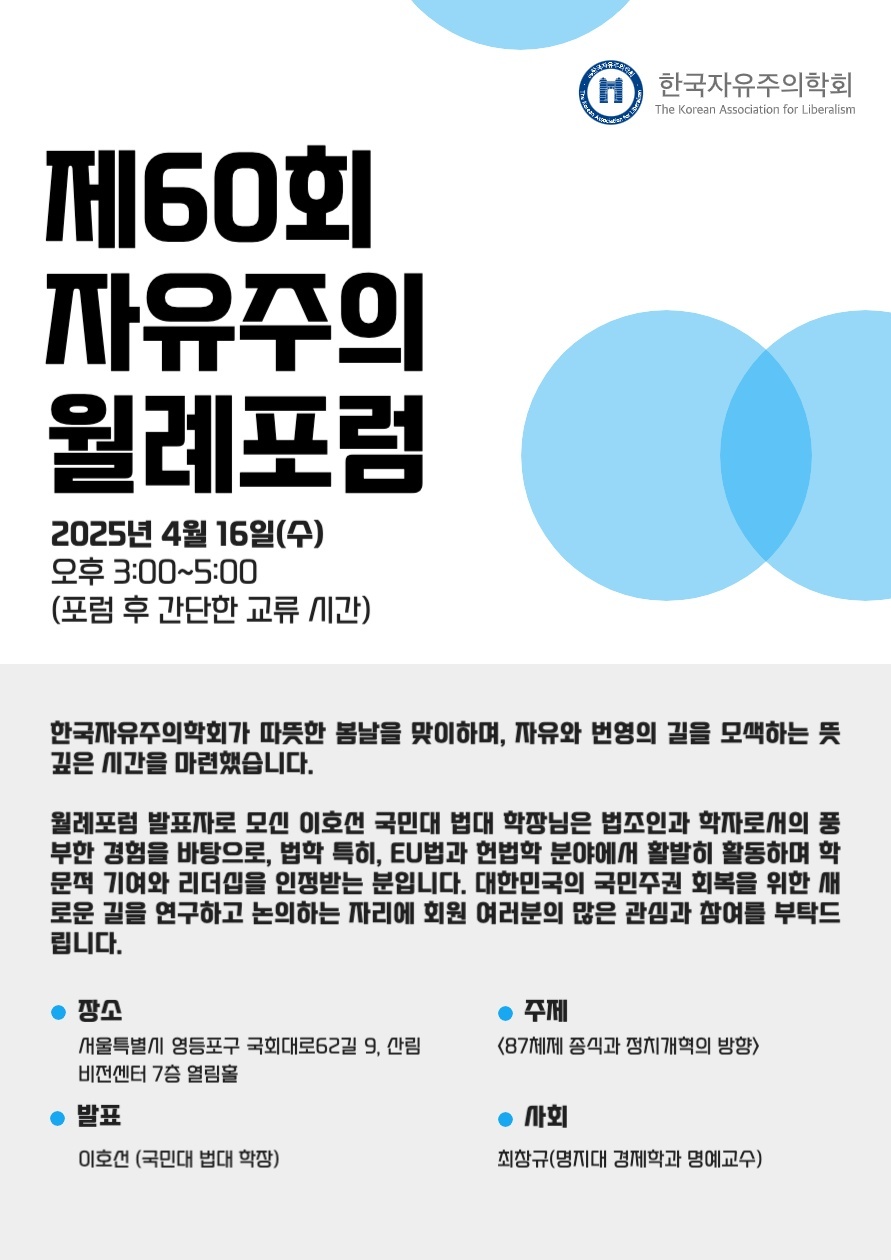 한국자유주의학회 제60회 자유주의 월례포럼 개최 안내