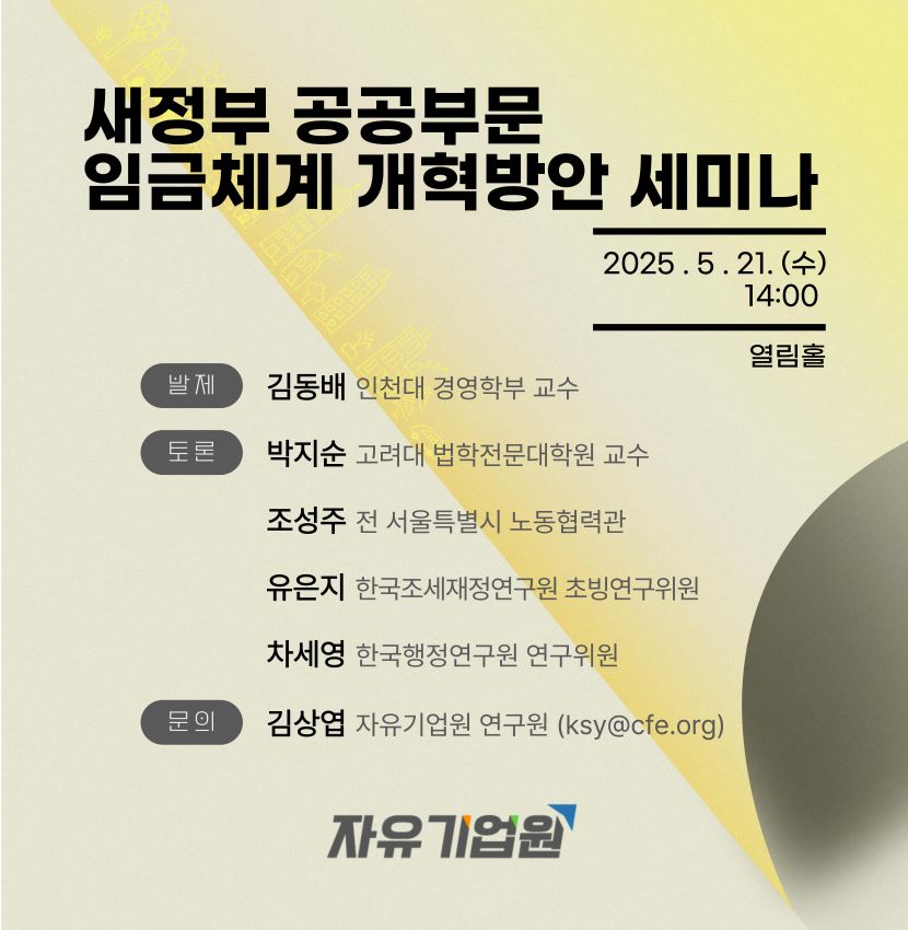 주 4일제·주 4.5일제 등 노동일수 단축 논의가 대선의 주요 의제 중 하나로 떠오르고 있는 가운데 공공부문부터의 임금체계 개혁이 더 중요한 과제라고 판단됩니다. 이에 이번 세미나를 통해 호봉제 등 공공부문 연공서열식 임금구조의 문제점과 현재 진행중인 공공기관의 직무급제 전환 추진상황을 검토할 예정입니다.