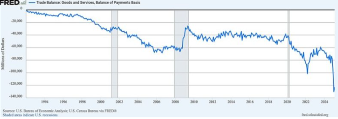 미국은 1975년 이래로 매년 국제 수지 적자를 냈고, 그 반세기 동안, 미국 경제는 번영했다. 세인트루이스 연방 준비 은행은 실질 산출량(GDP)이 오늘날에는 그것이 2000년에 그랬던 것보다 60%만큼 더 높다고 보고한다.