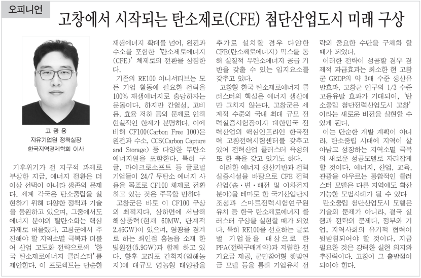 기후위기가 전 지구적 과제로 부상한 지금, 에너지 전환은 더 이상 선택이 아니라 생존의 문제다. 세계 각국은 탄소중립을 실현하기 위해 다양한 정책과 기술을 동원하고 있으며, 그중에서도 에너지 분야의 탈탄소화는 핵심 과제로 떠올랐다. 고창군에서 추진해야 할 지역소멸 극복과 더불어 산업 고도화 전략으로써 '한국 탄소제로에너지 클러스터’를 제안한다. 이 프로젝트는 단순한 재생에너지 확대를 넘어, 원전과 수소를 포함한 '탄소제로에너지(CFE)’ 체제로의 전환을 상징한다.