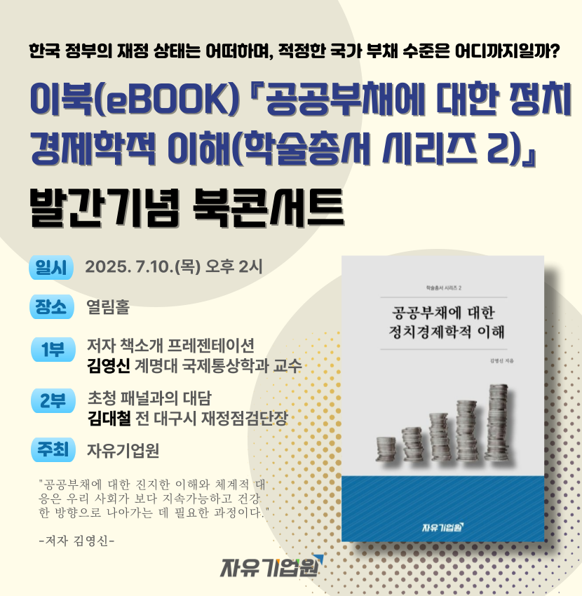 오늘날 공공부채는 국가의 미래, 정치의 작동방식을 반영하는 정교한 거울입니다. 이번 발간기념 북콘서트에서는 『공공부채에 대한 정치경제학적 이해』의 주요 내용을 중심으로, 공공부채 증가의 구조적 원인과 그에 얽힌 정치·경제적 맥락을 함께 보고자 합니다.