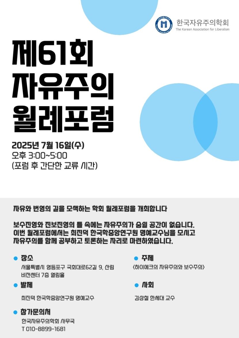 한국자유주의학회 제61회 자유주의 월례포럼 개최 안내