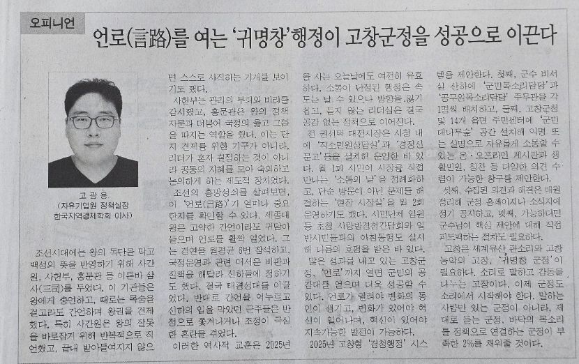 많은 성과를 내고 있는 고창군정, '언로’까지 열면 군민의 공감대를 얻으며 더욱 성공할 수 있다. 언로가 열려야 변화의 동인이 생기고, 변화가 있어야 혁신이 일어나며, 혁신이 있어야 지속가능한 발전이 가능하다.
