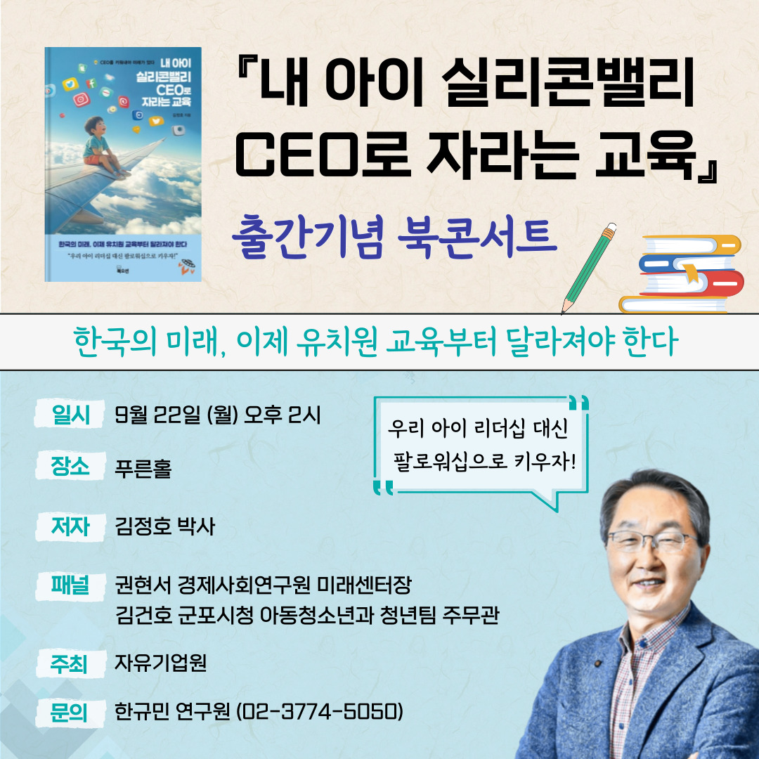 실리콘밸리 CEO들의 이야기를 통해 한국 교육의 한계를 짚고 새로운 교육 방향을 제시한 『내 아이 실리콘밸리 CEO로 자라는 교육』 출간 기념 북콘서트를 개최합니다.