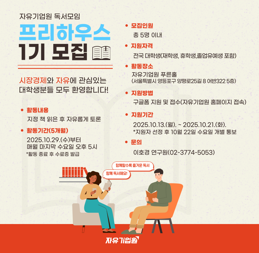 자유기업원의 대학생 독서모임 프리하우스 1기에서 책을 매개로 생각을 나누고, 자유로운 토론의 즐거움을 함께 경험해보세요!