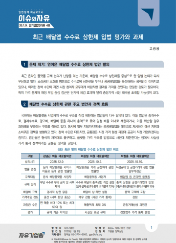 최근 온라인 플랫폼 규제 논의가 난항을 겪는 가운데, 배달앱 수수료 상한제를 중심으로 한 입법 논의가 다시 부상하고 있다. 소상공인 보호를 명분으로 수수료에 상한선을 두거나 공공배달앱을 육성하려는 움직임이 이어지고 있으나, 이러한 정책 수단이 과연 시장 참여자 모두에게 바람직한 결과를 가져올 것인지는 면밀한 검토가 필요하다. 특히 가격 통제와 재정 투입 중심 접근은 단기적 체감 효과와 달리 중장기적 시장 왜곡을 초래할 가능성이 크다.