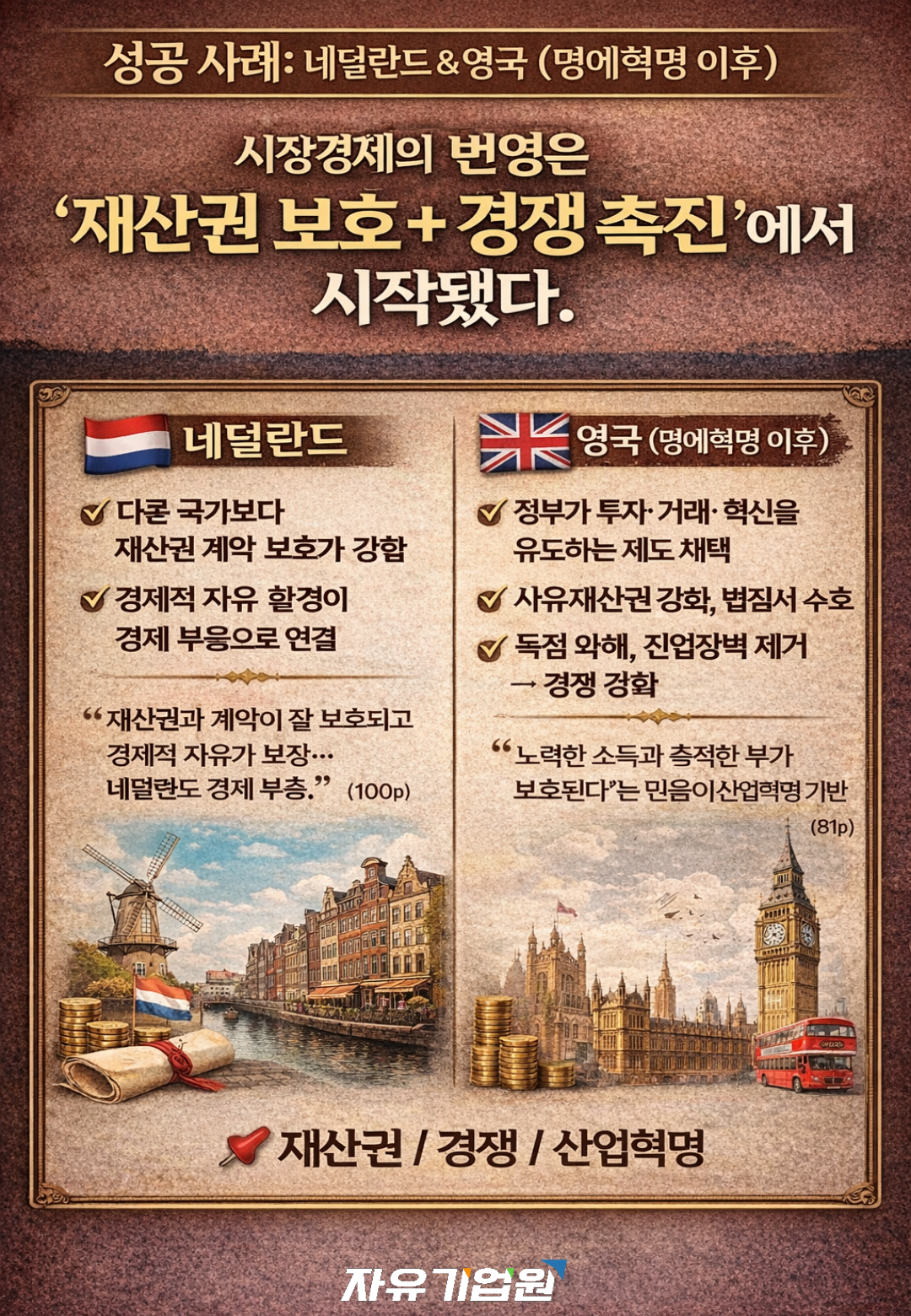 반대로 성장의 장면은 다른 방향에서 나타났다. 정부 개혁이 개인의 자유와 사유재산을 보호하는 쪽으로 이루어지고 규제가 줄어들자, 사람들은 더 많이 실험하고 더 효율적인 방법을 찾기 시작했다. 네덜란드는 재산권과 계약이 비교적 잘 보호되는 환경 속에서 경제적 자유가 작동했고, 그 흐름이 시장을 부흥시켰다.