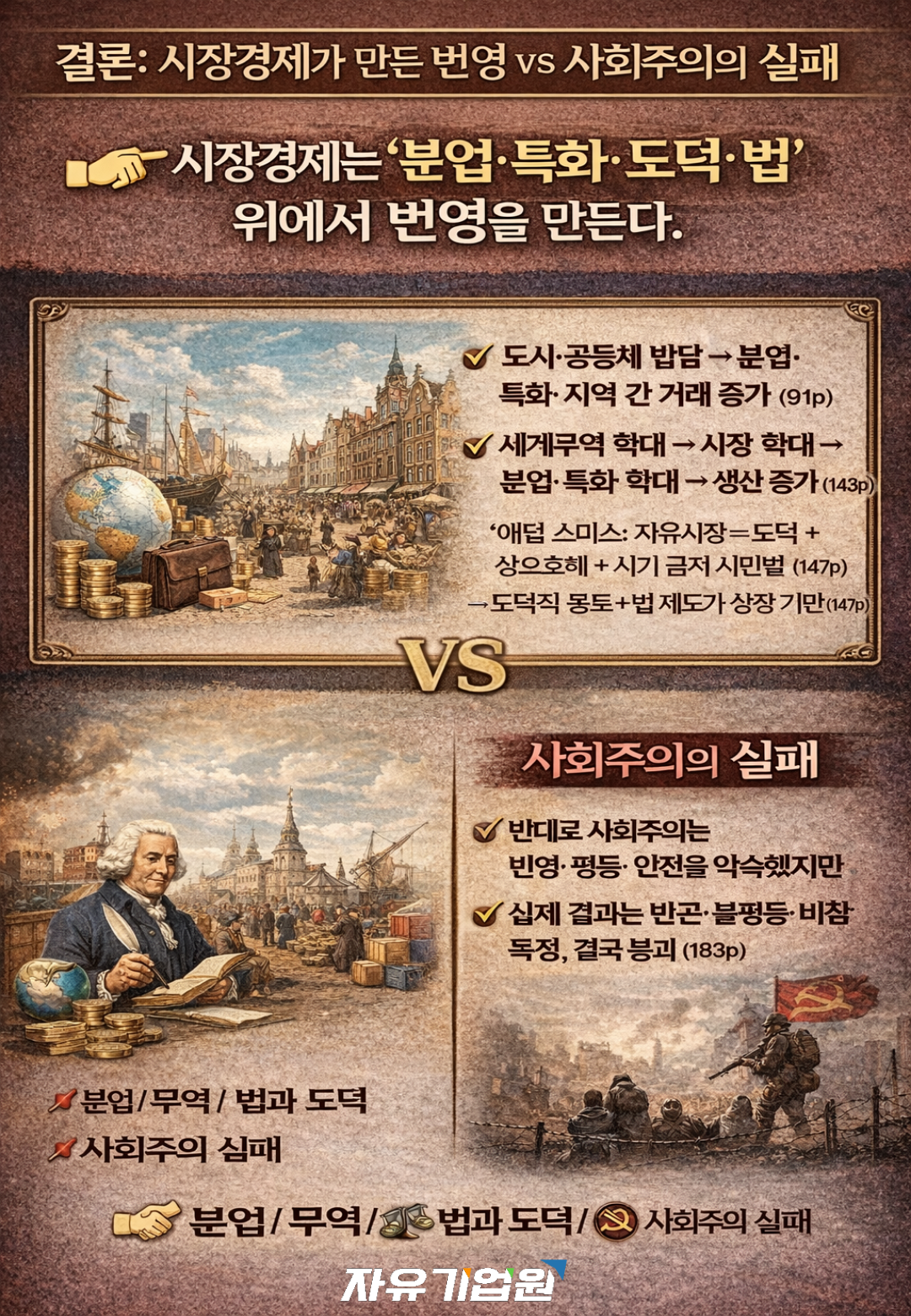 시장경제가 성장한 핵심 배경은 단순하지 않다. 하지만 책이 반복해서 보여주는 흐름은 비교적 분명하다. 사람들의 경제 활동이 활발해지려면 자유롭게 시도할 공간이 필요했고, 동시에 그 결과가 지켜질 수 있도록 기본적인 규칙과 질서도 뒷받침돼야 했다.