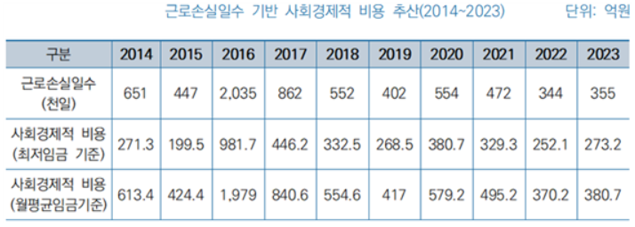 - 근로손실일수 기반 사회경제적 비용 추산결과, 최소 3,735억원~6,654억원