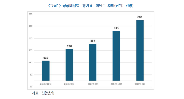 국내 배달앱 시장은 배달의 민족(이하 배민), 쿠팡이츠(이하 쿠팡)가 양분하고 있는 가운데 후발주자로 뛰어든 업체 중 유의미한 성과를 보이고 있는 곳이 바로, 신한은행이 2022년 1월에 출시한 민관협력형 공공배달앱 '땡겨요’다. 땡겨요는 상인들 입장에서 저렴한 중개수수료 2%, 광고비 무료 등을 걸고, 서울시와 협력하면서 가격경쟁력과 지자체의 전폭적 지원이라는 강점을 갖고 시장에 뛰어들고 있다. 지난 4월, 서울시-치킨 프랜차이즈 18개 사 간 '서울배달+ 가격제’를 도입하기로 협약하기도 했다. 땡겨요 회원수는 2022년 165만명에서 2025년 5월 기준, 500만명 까지 증가해 매년 약 100만명 이상 가파른 성장세를 보이고 있다.