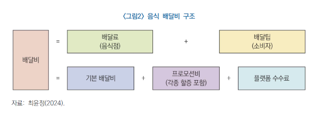 음식배달서비스 플랫폼의 구조는 음식의 주문 가격에 배달비를 합하여 소비자에게 청구한 뒤, 일부 수수료를 제외한 배달비를 배달원에게 다시 지급하는 형태의 수익구조를 지닌다(최윤정, 2024). 배달비는 크게 외식업 사업자가 지불하는 '배달료’와 소비자가 부담하는 '배달팁(배달서비스이용료)’의 합으로 구성되며, 주문 금액 및 시간대, 이동거리에 따라 달라질 수 있다. 배달대행서비스 공급자 관점에 배달비는 '기본 배달비’, '프로모션비(홍보비 등)’, '플랫폼 수수료’로 구성된다.