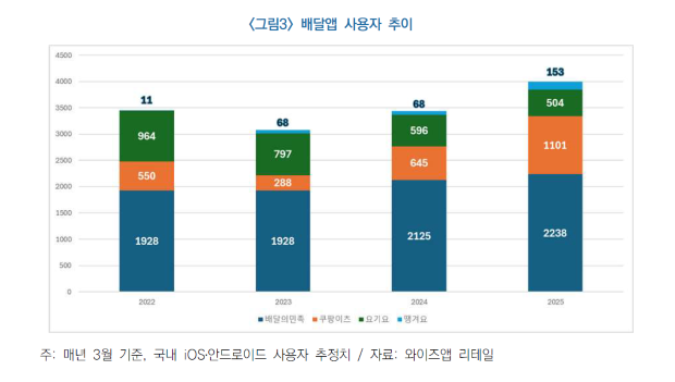 배달앱 사용자는 2022년 3,453만명에서 2023년 3,081만명으로 감소, 2024년 3,434만명으로 반등하는 등 정체 현상을 보이다, 2025년 약 4,000만명으로 다시 크게 증가했다. 우리나라 총인구(5,168만명)의 약 77.3% 수준으로 국민 대다수가 배달앱을 이용하고 있다는 것이다. 이는 2022년까지 코로나 여파로 배달시장이 커졌다 줄어든 2023년 이후, 소비자들의 배달서비스 만족도에 대한 기억을 바탕으로 점차 시장이 다시 회복 및 성장하는 추세로 판단된다.