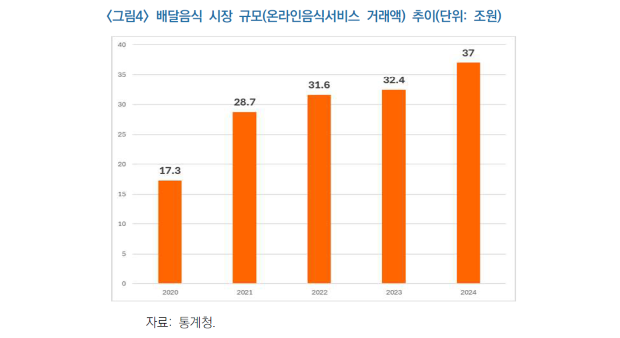 국내 배달음식 시장 규모를 통계청 온라인음식서비스 거래액으로 추산하여 그 추이를 살펴보면, 2020년 17.3조원에서 2025년 37조원으로 약 5년 간 2.14배 증가한 것으로 나타났다. 배달앱 사용자의 경우 2023년에 크게 감소했다가 다시 증가하는 모양새를 보인 반면, 배달음식 시장 규모(거래액)는 코로나19 여파 크게 성장한 이후에도 줄지 않고, 계속해서 증가하는 것으로 나타났다.
