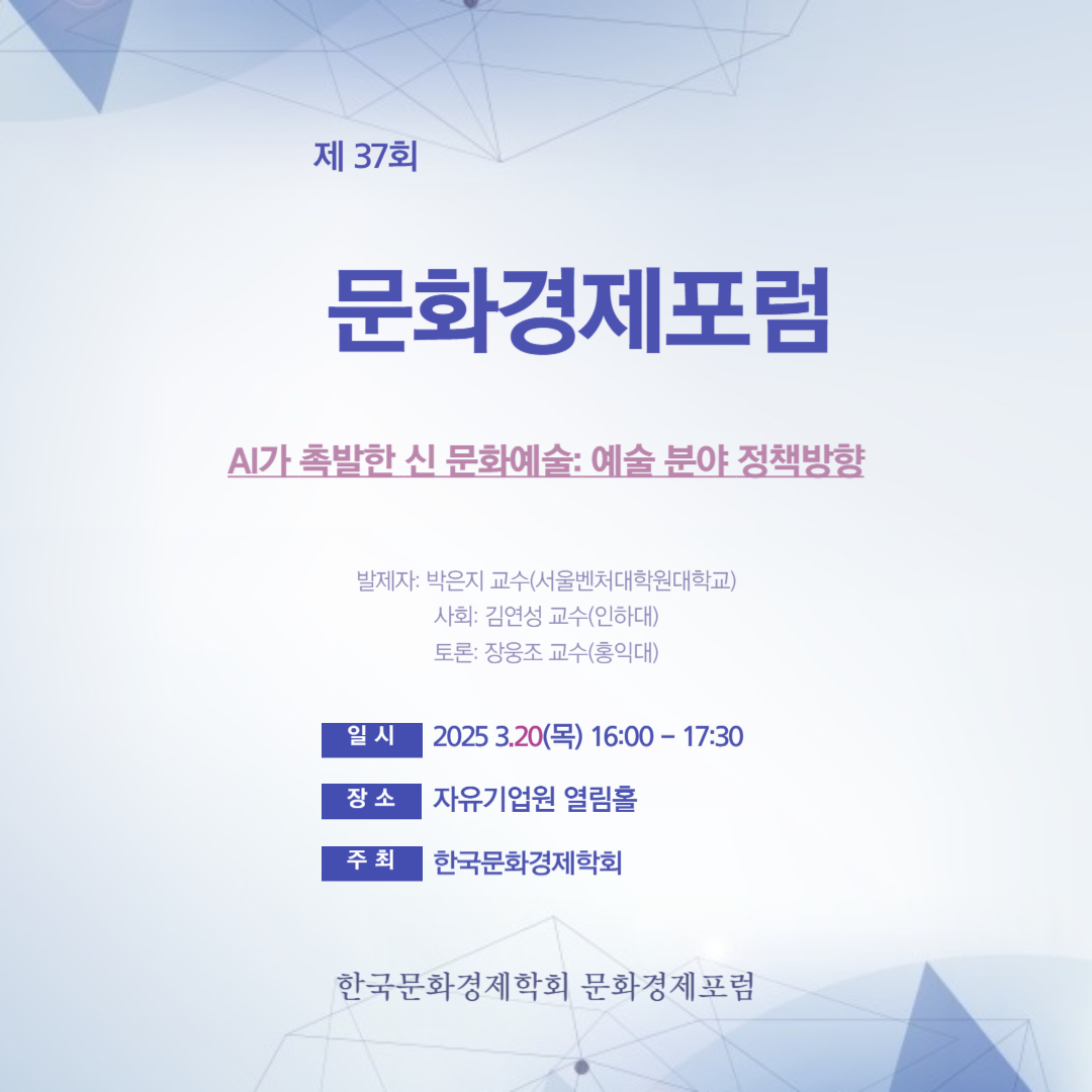 소개 정보 활동 모임 대회 영상 도서 소개 찾기 공지사항 설립취지 인사말 조직도 비전 CI소개 오시는길 공지사항 보도자료 후원안내 Memorial Hall [문화경제포럼]AI가 촉발한 신 문화예술: 예술 분야 정책방향 글쓴이 자유기업원 2025-03-12 2025년 3월 20일 목요일 오후 4시 세미나를 개최합니다.일시: 2025.3.20(목) 오후 4시장소: 자유기업원 열림홀주최: 한국문화경제학회 목록보기 관련글 제42회 문화경제포럼 이전글 자유기업원 서포터즈 9기 합격자 발표