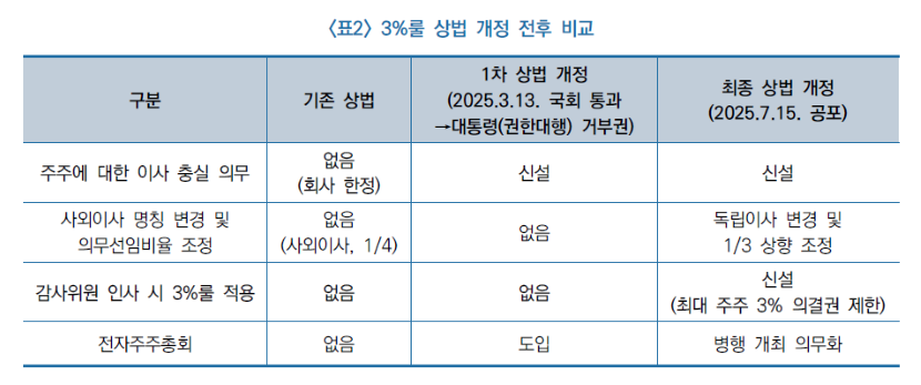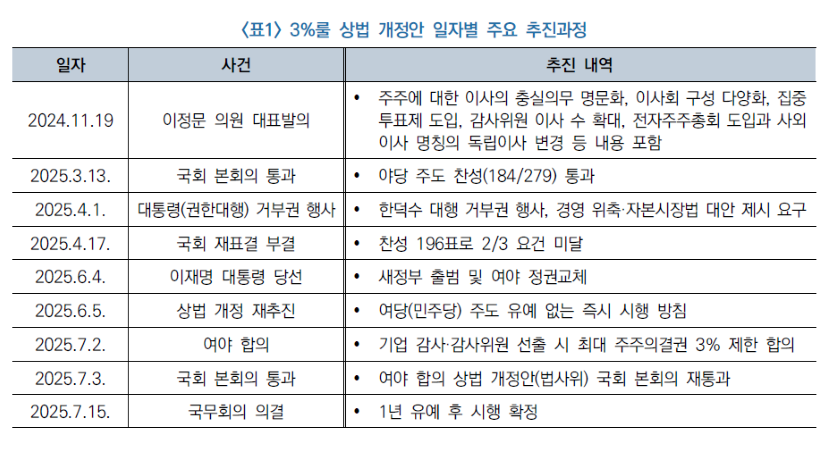 지난 7월 3일, 여야 합의로 3%룰이 포함된 상법 개정안이 국회 본회의를 통과하고, 12일이 지난 7월 15일, 국무회의 의결로 최종 공포되었다. 이번에 처리된 상법 개정안의 최근 추진과정을 정리하면 다음과 같다. 2024년 11월 19일, 이정문 의원 대표발의로 주주에 대한 이사의 충실의무, 집중투표제 도입, 감사위원 이사 수 확대, 사외이사의 독립이사 변경 등이 포함됐는데, 최근 처리된 상법 개정안의 상당수가 담겨 있었다. 이후 2025년 3월 13일, 국회 본회의에서 개정안이 재적의원 3분의 2 이상 찬성을 얻어 통과되었으나, 4월 1일 당시 대통령 권한대행이었던 한덕수 국무총리는 경영 위축 우려와 자본시장법 개정 등의 대안 마련 필요성을 이유로 거부권을 행사하였다. 이에 따라 국회는 4월 17일 재표결에 나섰지만, 개정안은 3분의 2 요건에 미달하여 부결되었다.