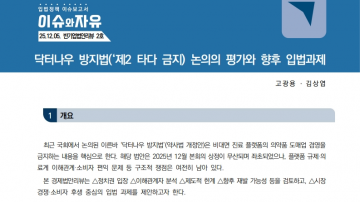 자유기업원은 최근 국회에서 논의된 이른바 '닥터나우 방지법’(약사법 개정안)을 플랫폼 혁신을 제약하고 소비자 선택권을 축소시키는 대표적 선(先)규제 사례로 진단했다. 이 법안은 비대면 진료 플랫폼의 의약품 도매업 겸영을 금지하고 약국 직역 보호를 명분으로 추진되었으나, 실제 피해 사례가 불명확함에도 가능성만을 근거로 사업모델을 제한해 '제2의 타다 금지법’과 유사한 구조를 보인다. 이해관계자인 약사단체는 강하게 찬성했지만, IT·스타트업 업계와 다수 소비자는 편의성 저하와 혁신 저해를 우려했으며, 플랫폼 공정성 문제 역시 별도의 사후규제·공정거래 제도로 해결 가능하다는 점에서 선규제의 정당성은 약하다는 분석이다. 자유기업원은 향후 입법 과정에서 사후규제 중심 전환, 의약품 유통 투명성 강화, 배타계약 제한, 소비자 후생 평가 의무화 등 시장경쟁·소비자 편익을 우선하는 제도 설계를 제안했다.
