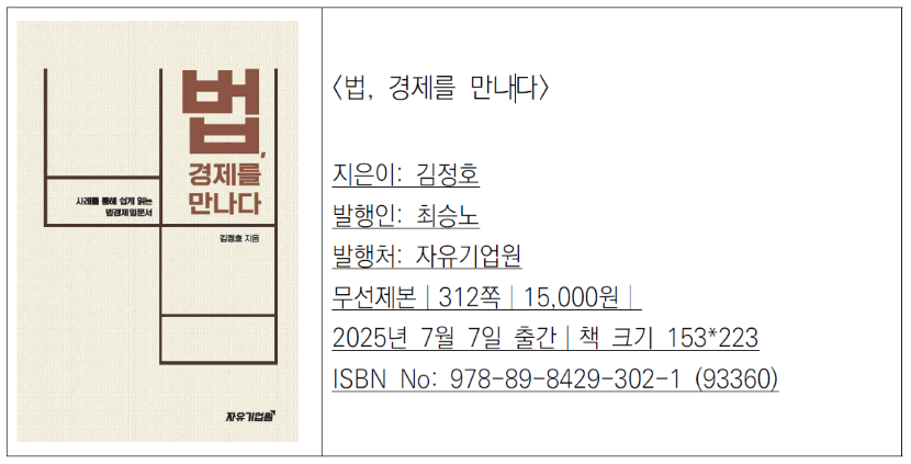 어느 때보다 법과 제도가 개인의 자유, 재산, 선택을 규정하는 현대 사회에서 우리는 다음과 같은 질문을 던지게 된다. “왜 법은 존재하는가? 그 법은 누구를 위해, 어떤 기준으로 만들어져야 하는가?” 이 질문에 대해 김정호 박사는 법을 경제학의 언어로 다시 해석하며, 자유와 번영의 조건을 설명한다. 자유기업원에서 출간(7월 7일 발행 예정)한 『법, 경제를 만나다』는 법률과 제도를 시장경제 원리로 분석한 법경제학 입문서다.